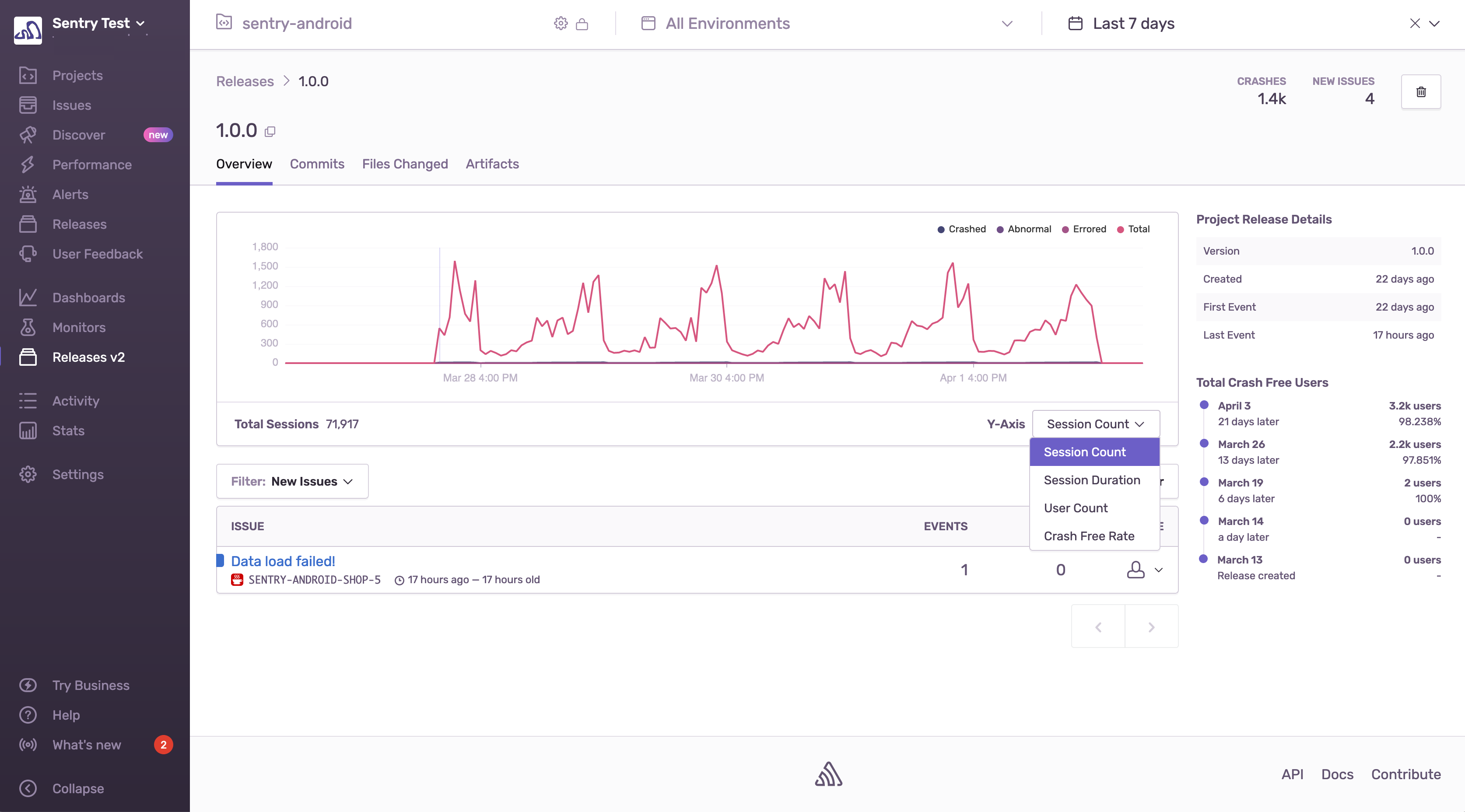 You’ll now start seeing commit data in your Sentry account. With commit data for each release, you can see which files have changed most recently and who pushed code, which helps debug new errors as they occur.