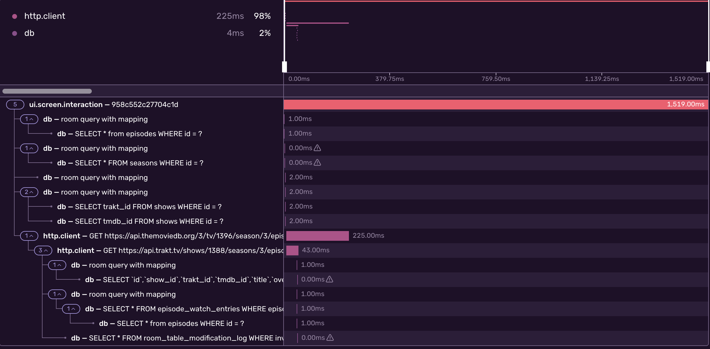 On the screenshot above, there's a parent span ui.screen.interaction that contains multiple child spans, for instance, the network request span with a http.client operation, duration 225ms and a request url as a description. If you want to learn more about performance monitoring @ Sentry, check this post out.