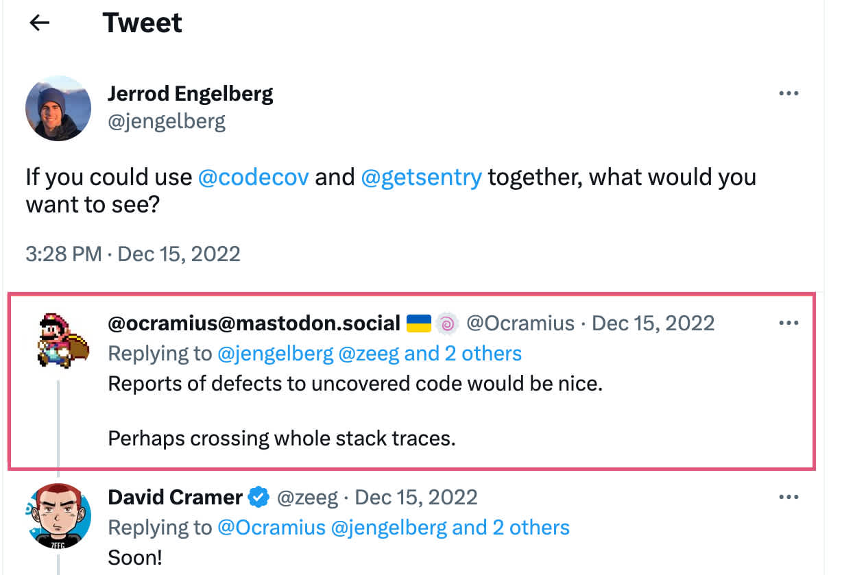 Unsurprisingly, we are big fans of building obvious products that don’t exist (yet), and most developers we talked to wanted to see the testing status of error-producing code. When Sentry acquired Codecov, an integration of this type was your most common response: