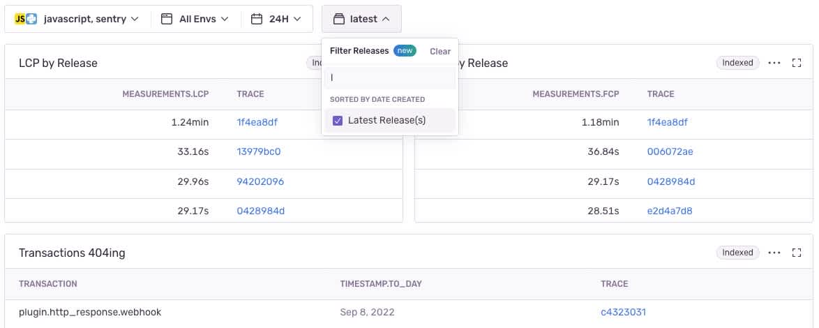 Maybe Web Vitals are important to your team and you want to make sure that a new release doesn’t introduce a basket full of latency issues. Anyone on your team can build a custom dashboard with Performance data for your latest release - track LCP, FCP, CLS, FID, or transactions 404ing by release.