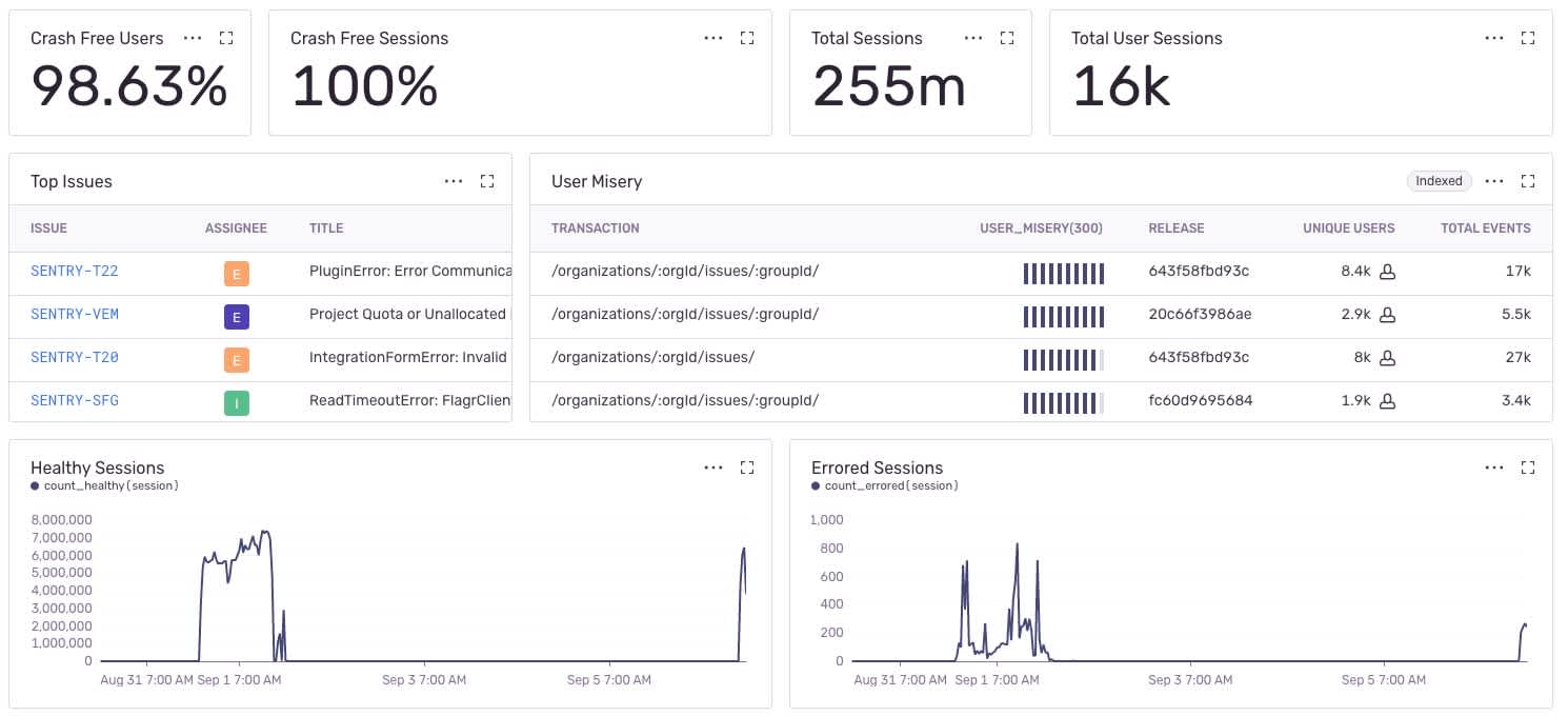 Unlike dated wallboards, dashboards aren’t a one size fits all feature. They’re effective and meaningful because they can be customized to fit any use case and any team’s needs. Adding Release widgets to Sentry Dashboards makes it so that any team can keep tabs on what they care about the most. From crash-free sessions to understanding how a release impacts performance – developer teams will always have the information they need to solve what’s urgent faster.