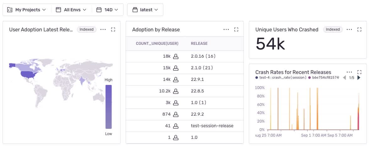 While those wallboards sure were beautiful, we rarely had a clear view on how a release was trending. With our latest update to Dashboards, we’re joining form and function with Release Health widgets and a new release filter. Whether you want to focus on your latest release or compare adoption and stability across releases, you can build and filter dashboards to tell you exactly how they are trending. At a glance, you’ll see