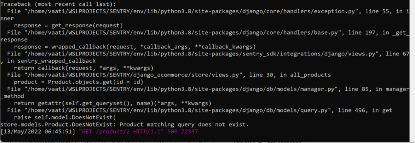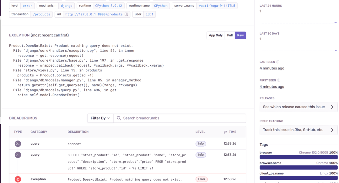 Let's create a database-related error in the database and see if Sentry can show us the cause. This is a sample error that I have in my local production caused by retrieving a product that doesn't exist in the database.