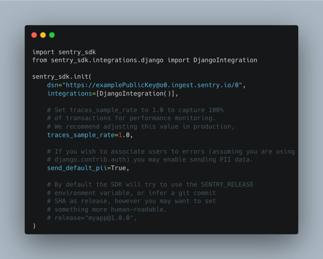 pip install --upgrade sentry-sdk The last step is to add the following code, which integrates your public key in the settings.py file in your Django application.