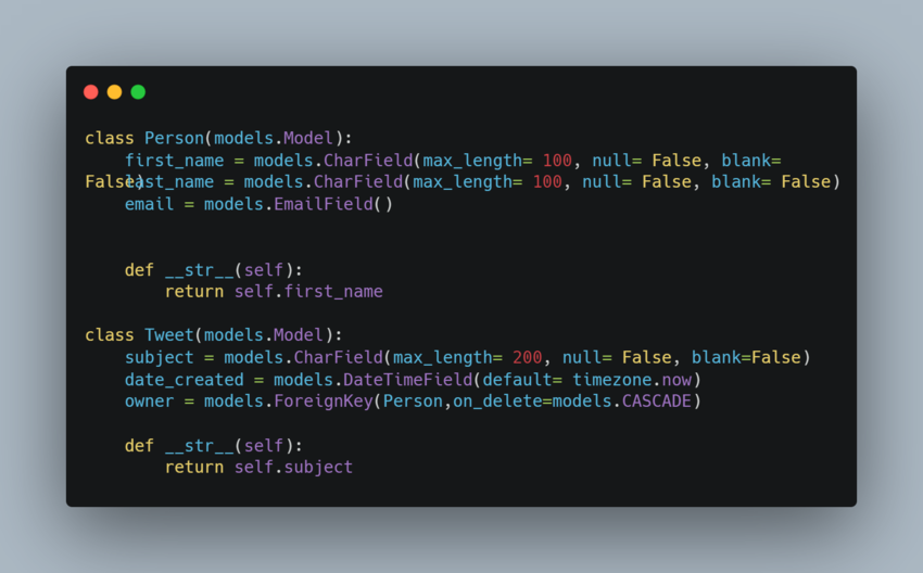 The person table has one-many relationships with the Tweet table, i.e., One person can have many tweets, but a tweet can only belong to a single person.