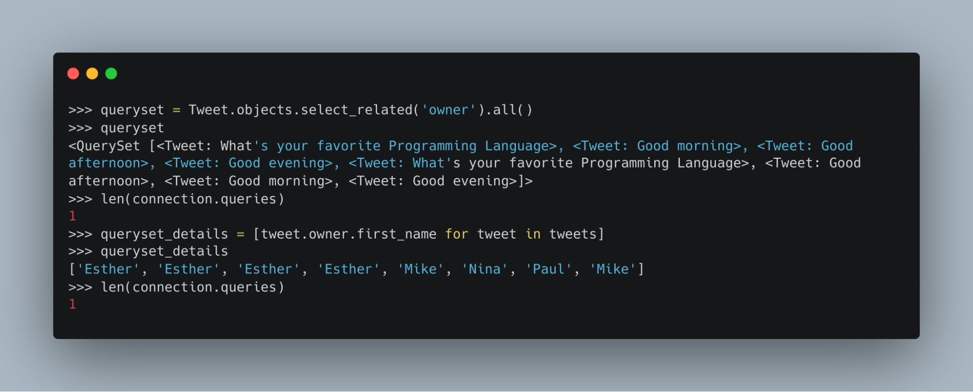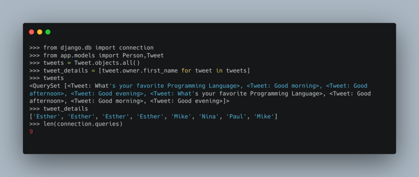 queryset = Tweet.objects.select_related('owner').all()The code above will get all the tweets and person data all at once, resulting in only a single query.