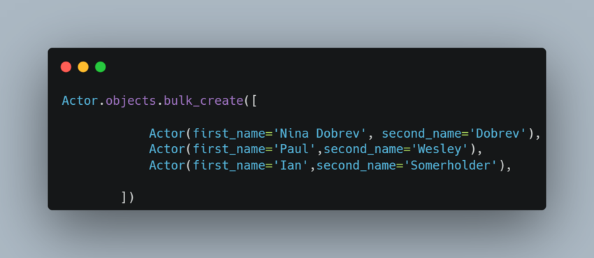 When you need to add multiple records to the database, the most efficient way is by creating all the objects at once. Luckily Django provides the bulk_create() method for that purpose. Rather than creating each instance at once and then returning it which overloads the database, bulk_create commits all the instances and does a single save query: