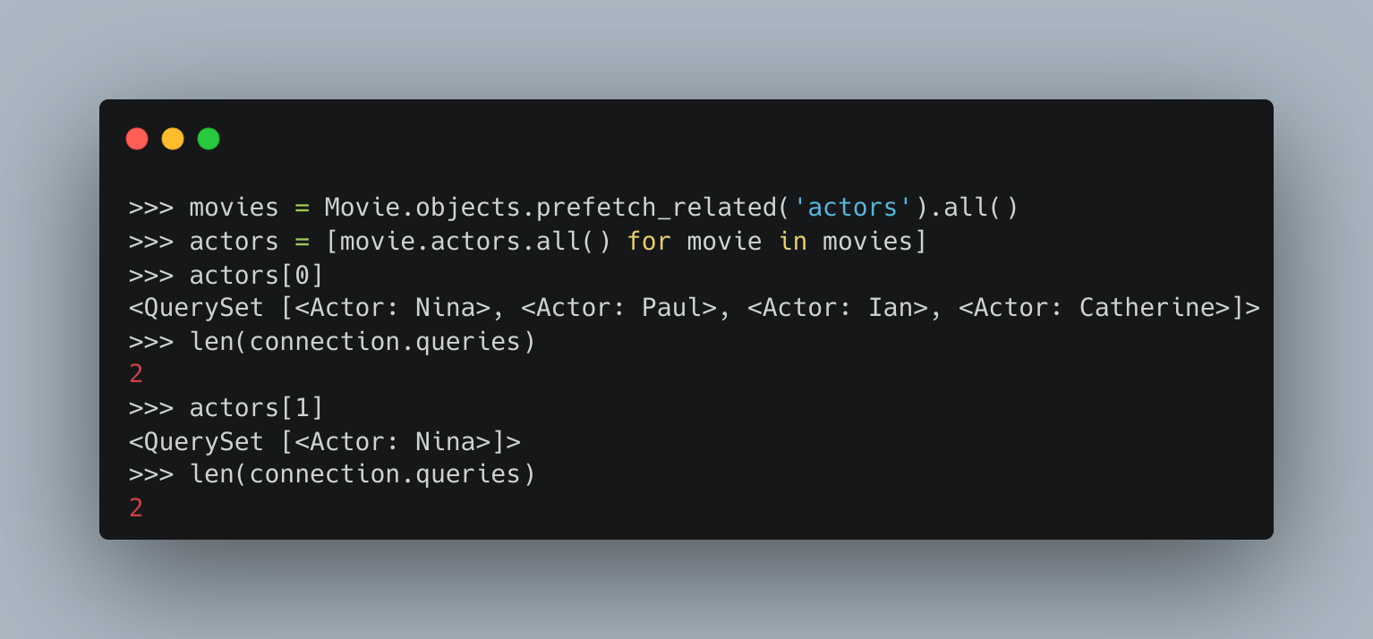prefetch_related, on the other hand, is used on many-to-many and many-to-one relationships. It results in one single query for all the models and filters specified in the query.