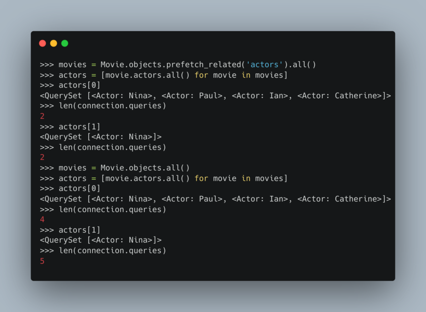 As you can see above, the query count is now 2, the first query fetches all the movies in the database, and the second and third request results in only a single query.