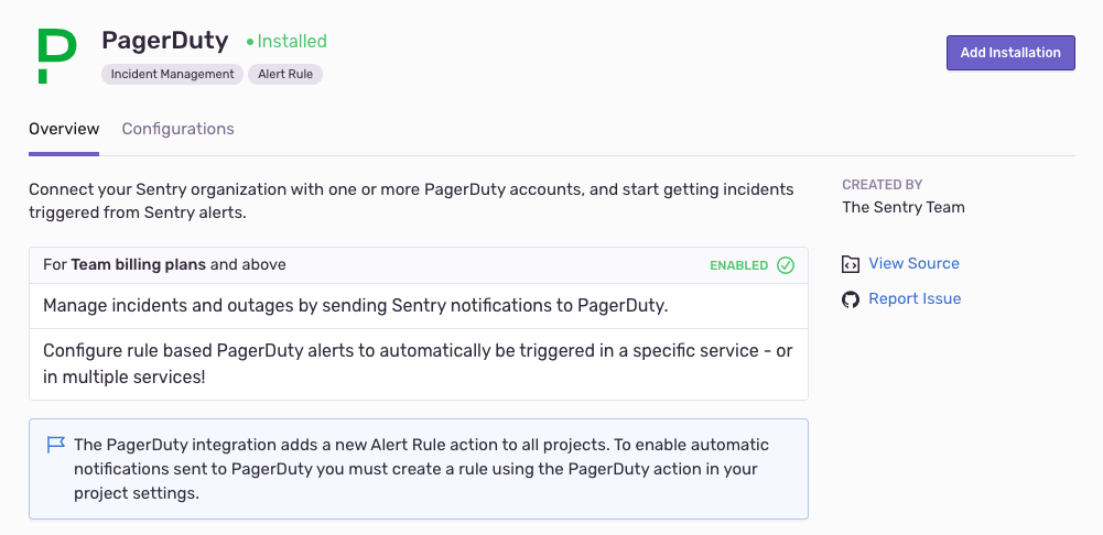 In Sentry, navigate to: Settings > Integrations. Then, find PagerDuty and click Add Installation. For a complete set of installation instructions, see our docs.