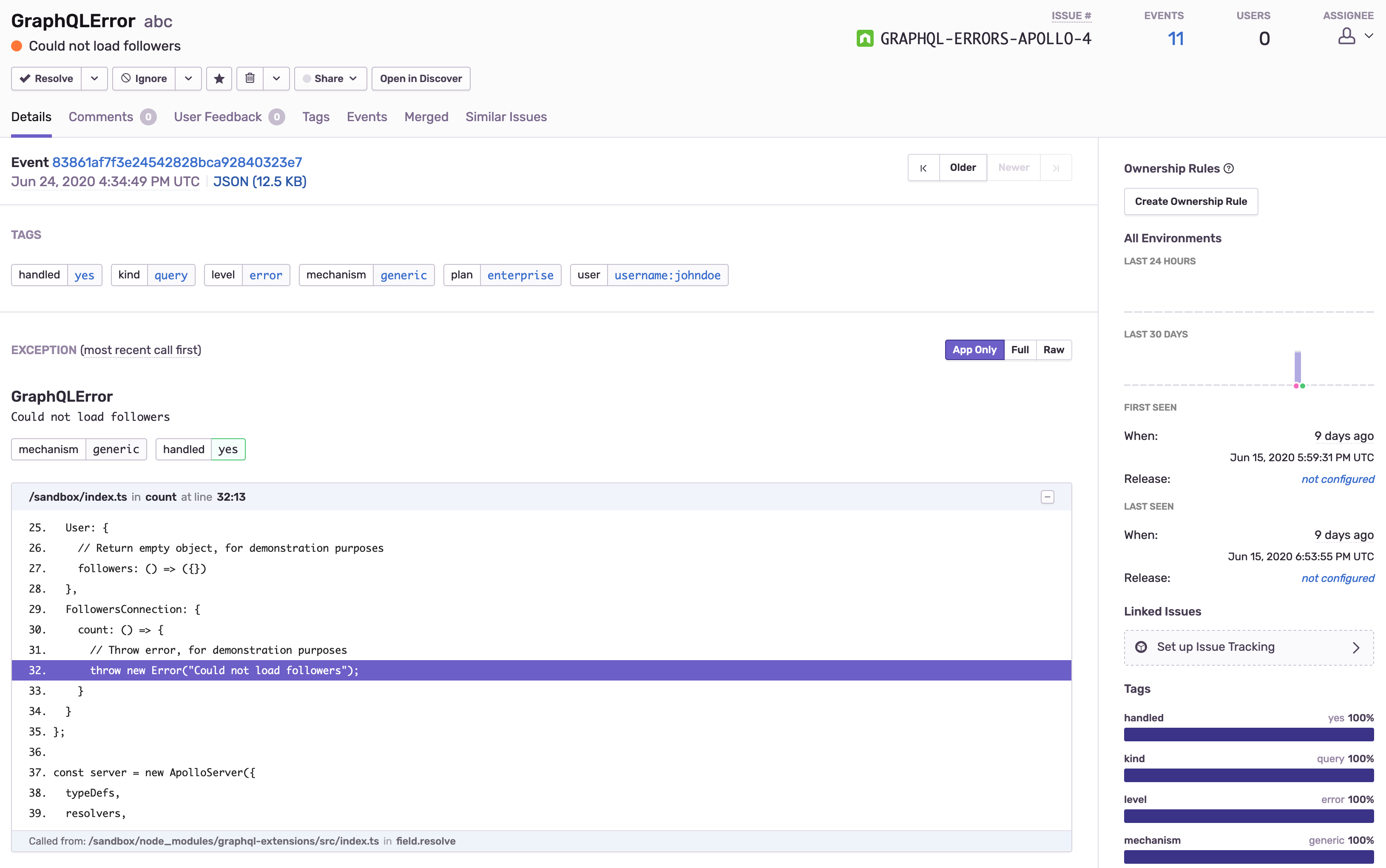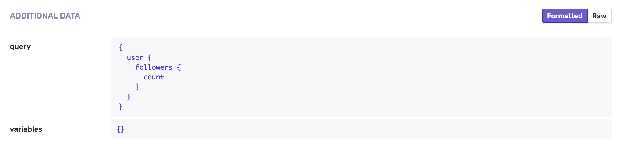 In addition to that, we can add detailed information about the query itself, be it the field that failed to resolve (e.g. the follower count), or the complete query, as well as user input supplied as variables.