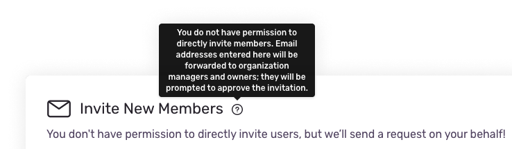Now, when non-administrators open up the Invite New Members modal, it changes contextually to become a "request to invite" rather than a direct invitation. Hitting "send" kicks off an email to all organization administrators, who are prompted to approve any outstanding requests.