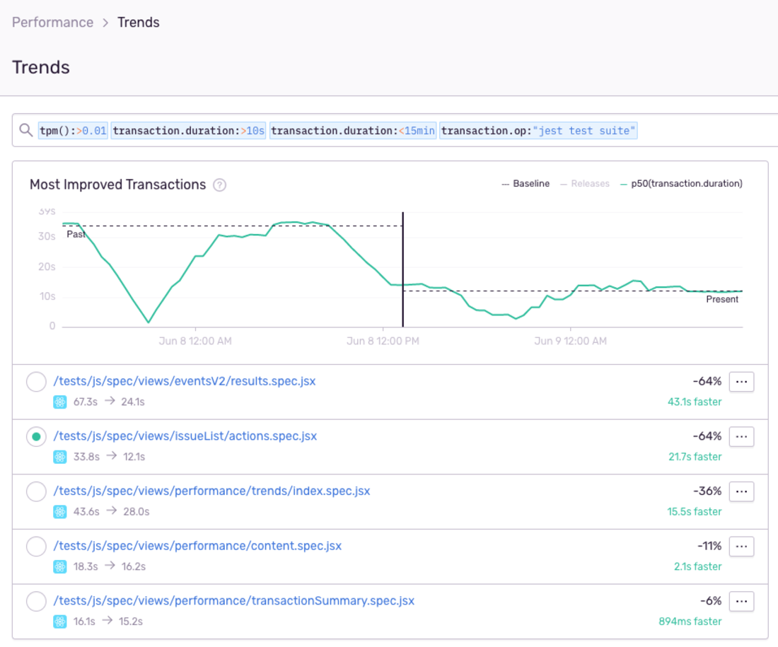 Using Sentry's Performance Trends feature, we can confirm the performance impact these changes made to the tests.