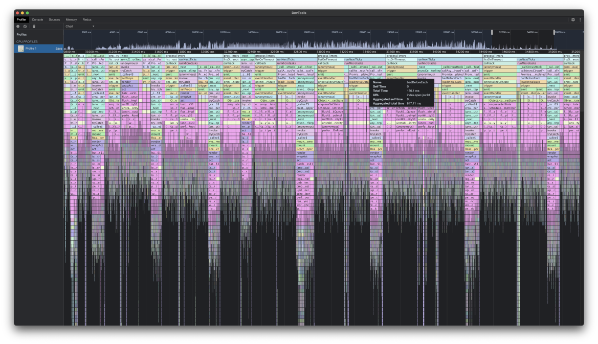 node --inspect-brk node_modules/.bin/jest --runInBand --no-cache tests/js/spec/views/alerts/rules/index.spec.jsxAfter profiling the test and zooming into the area where the tests are running, we located the code that runs during the beforeEach. In this screenshot, we've renamed the anonymous beforeEach function to a named function badBeforeEach so it can be found easier. Below it is one call to ProjectsStore.loadInitialData followed by several calls to setState and a bunch of react work being kicked off. This shouldn't be happening as there shouldn't be a component listening to the store yet.