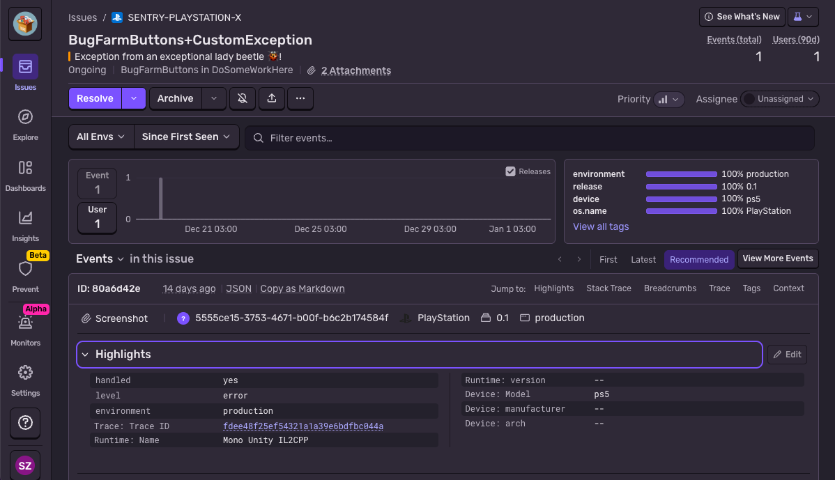 The Sentry SDK for Unity now provides native support for Xbox and PlayStation, bringing the full scope of Sentry's error tracking to gaming consoles. The SDK automatically syncs the scope to the native layer, so that when the game experiences a crash on consoles the captured issue has full stack traces with proper C# line numbers, Sentry provides custom contexts, tags, and breadcrumbs. This unified experience across all platforms makes it easier to triage and fix issues regardless of where they occur.