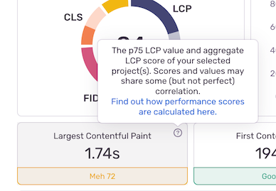 We have docs on what values are being displayed and how performance scores are calculated, but our user wanted more clarity around what specific values each UI component represented. After all, there is a big difference between the p99 and p50 of a metric. As a result, we updated our docs to include more detail, and we added a helpful tooltip in the product on the tiles, so everyone can see what calculation we’re using, right next to the metric itself.