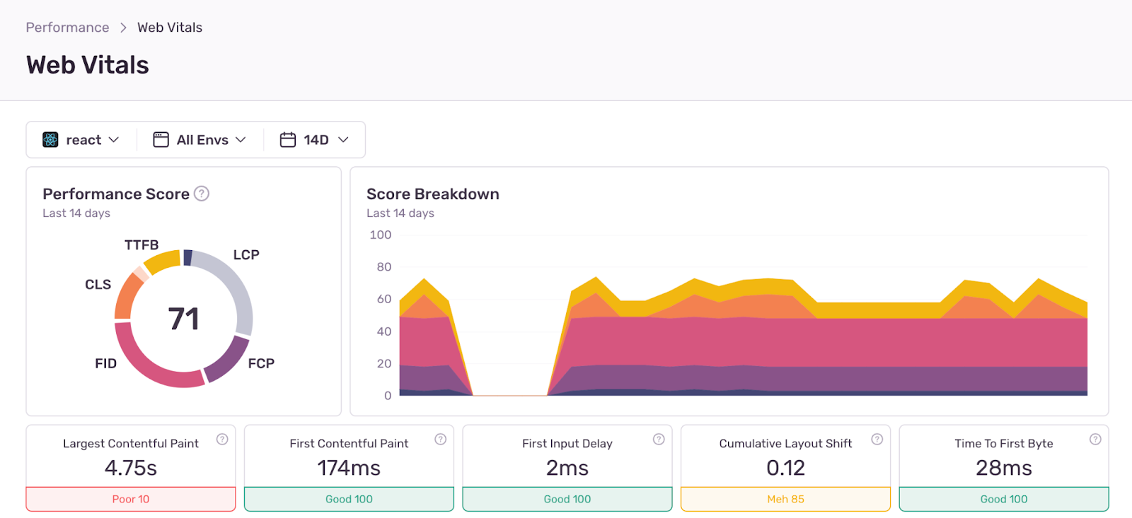 In the latest Web Vitals module, we display tiles of the 5 core Web Vitals and a performance score: