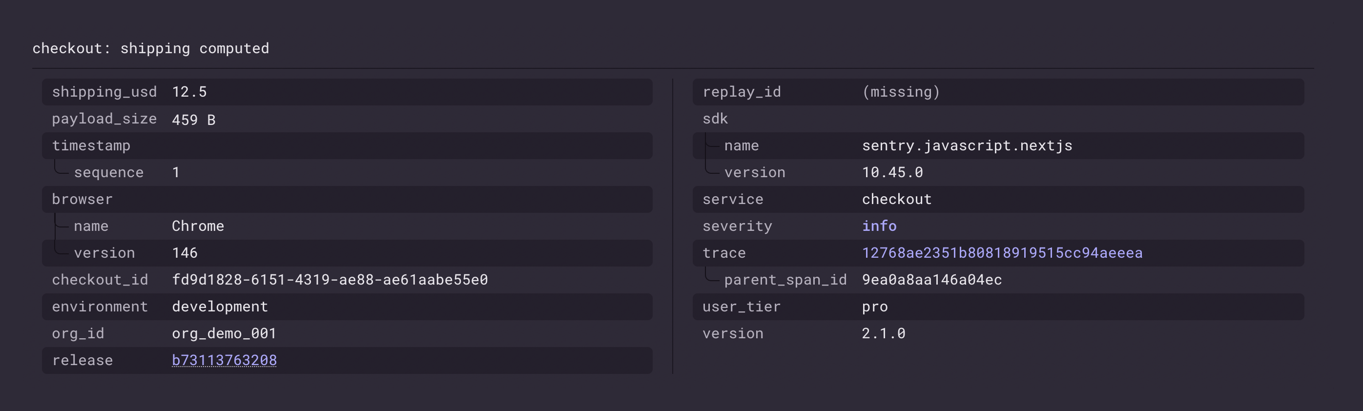 }In the Sentry Log Explorer, opening the checkout: shipping computed entry shows the fields passed to that log call (shipping_usd at 12.5 ) and the merged attributes applied to the same scope up til that point (service, version, org_id, user_tier and checkout_id).