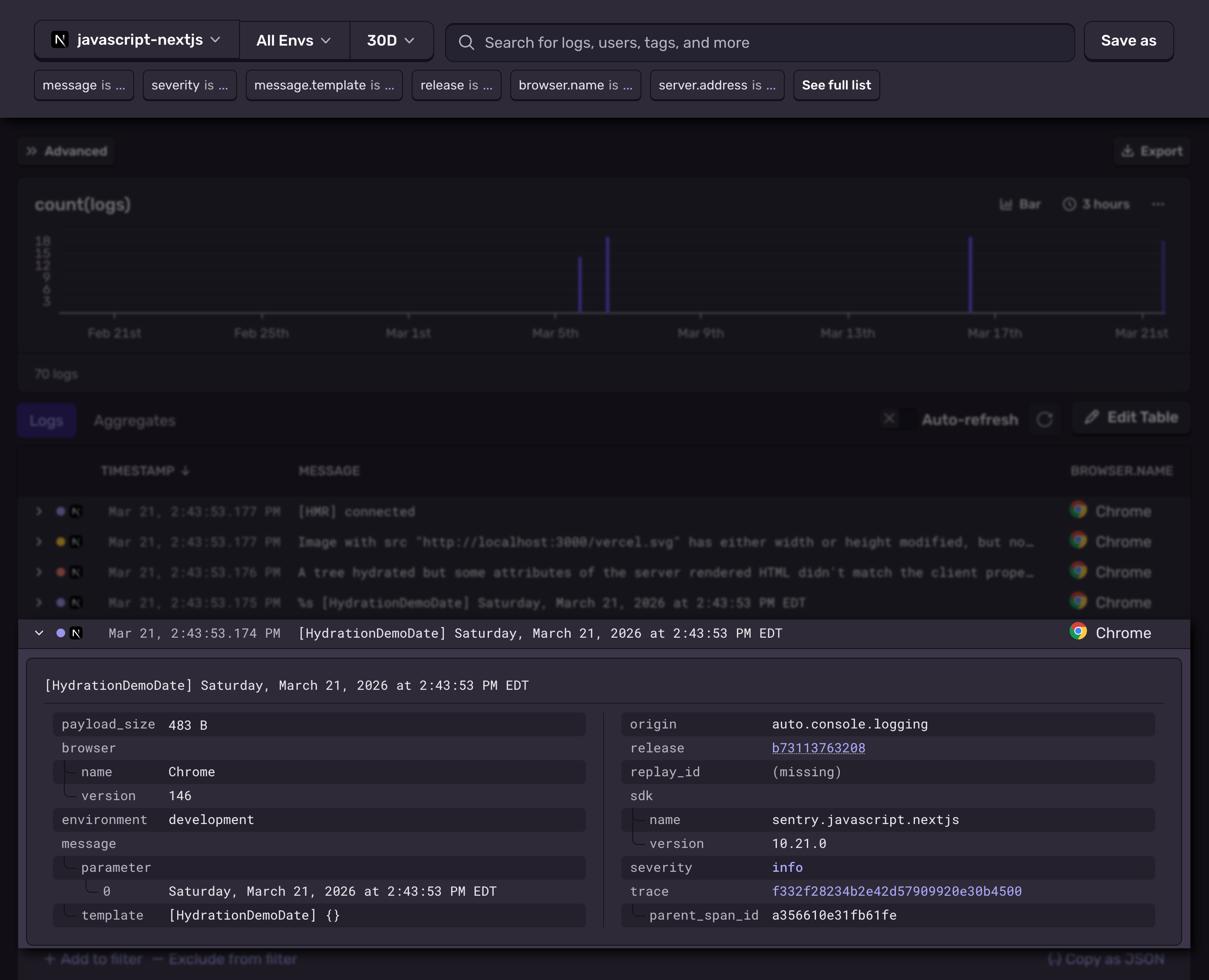 Sentry's Logger for Next.js is also runtime-agnostic, providing logging everywhere your Next.js app can run. And if you are already using Sentry, or plan to use Sentry for capturing errors and tracing anyway, you can add logging without adding any new dependencies.