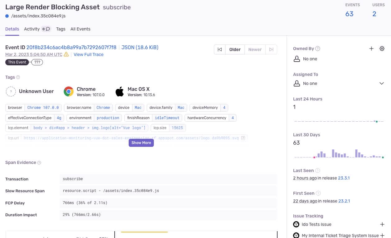 Sentry now highlights the long resource spans that are affecting page rendering and interactivity, as measured by the First Contentful Paint (FCP) and First Input Delay (FID) of your requests. These web vitals indicate whether your page load is successful and help you track user retention on your webpage. Large Render-Blocking Asset issues are grouped by the asset URL and accommodate for various methods of cache busting or asset splitting.