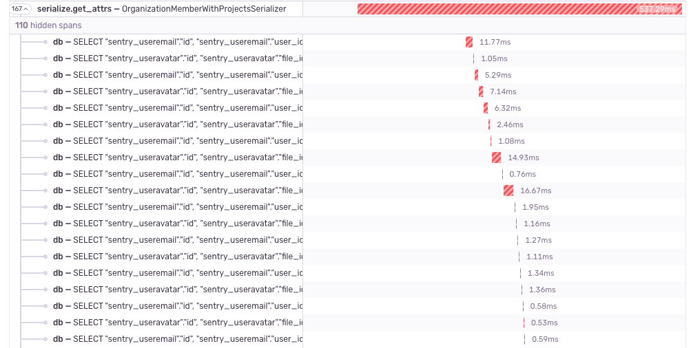 Sentry points out these MN+1 issues in your application, so you fix them and not only reduce execution time but also prevent database overload (from your N+1s left unhandled and queries that keep running in a loop).
