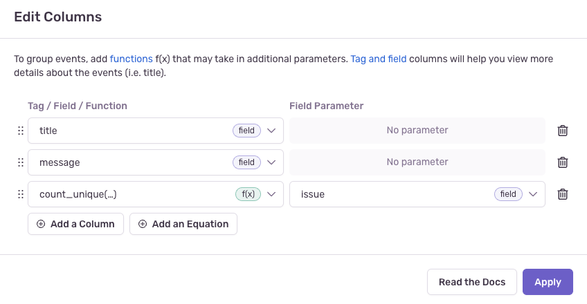 Then, change the columns to count the number of unique issues, grouping by the other two selected columns, title and message.