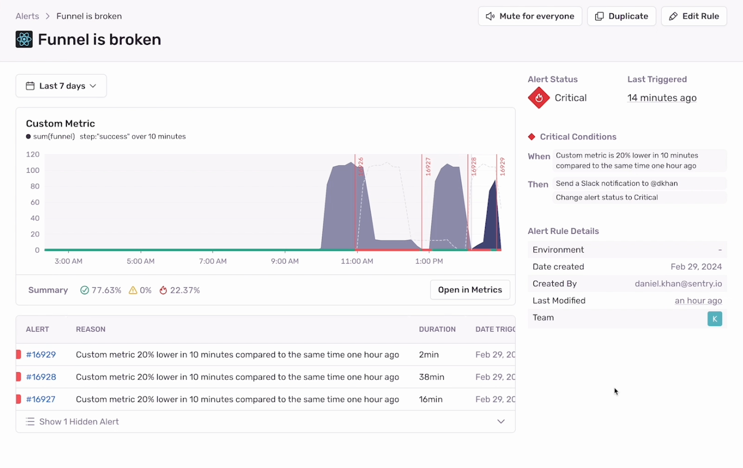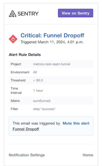 Metrics make it easy to spot anomalies at-a-glance, or you can create an alert to get notified by Slack, Discord, Teams, and/or Email if there are any significant changes. To make sure everything is working well in our checkout flow, we’ve set a threshold alert to trigger if checkout rates go down 20%.