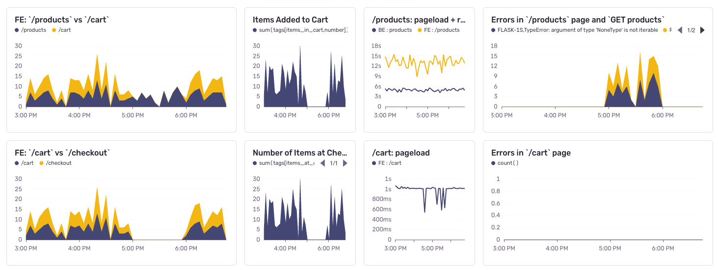 In this case, we saw a complete dropoff in the number of items people were adding to their carts. This would typically exist in a product analytics tool, which would be monitored by one team, and then we’d have to instantly escalate to a Sev1 incident and get a bunch of people on deck.