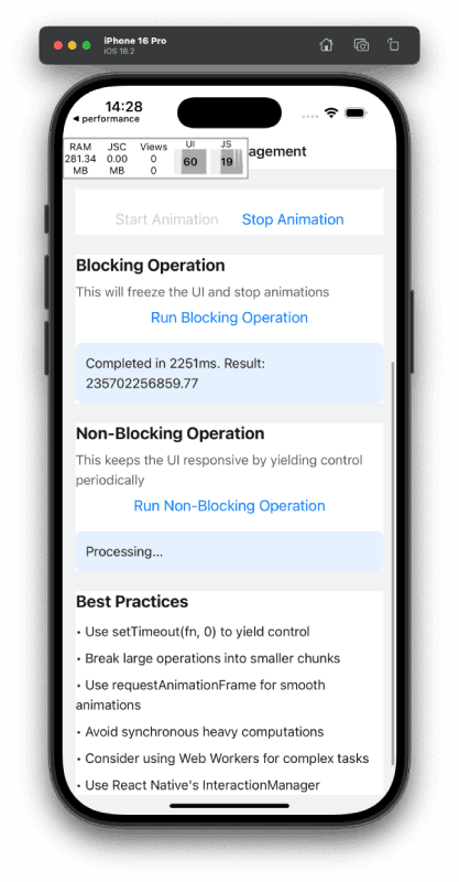 Remember, 60 FPS isn’t just a nice number — it’s the threshold where your app feels truly native to users. Use React Perf Monitor during development and Flashlight for detailed Android profiling. When your animations are smooth and your interactions are immediate, users notice.