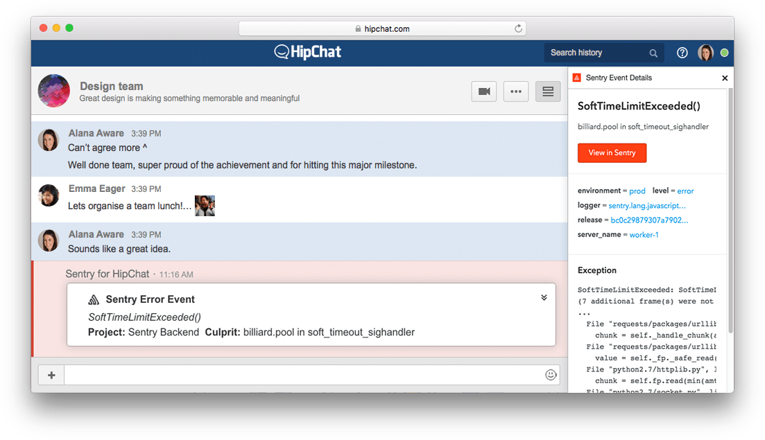 When Atlassian informed us that they are planning a new improved integration system called HipChat Connect, we were excited to see how we could leverage these new features into a powerful new Sentry plugin.