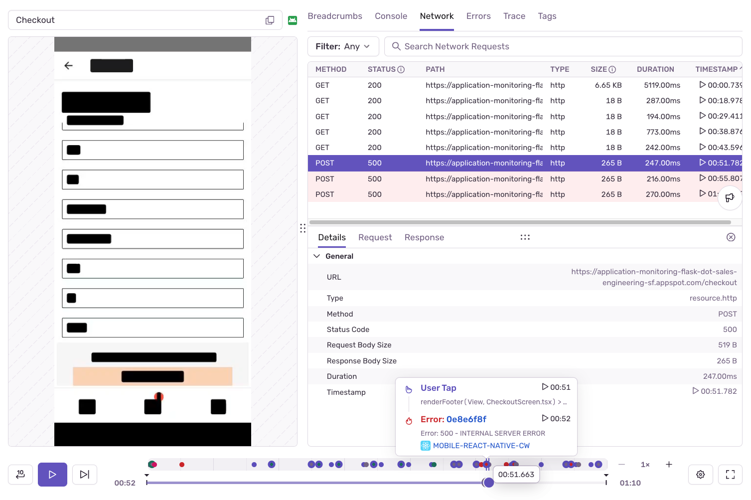 Debugging server errors can be challenging as it’s unclear what the user did to get there. But with Session Replay for Mobile, you can see the user actions that took place leading up to the endpoint issue. The timeline view allows you to pinpoint exactly when the server error occurred and quickly scrub to that point in time.