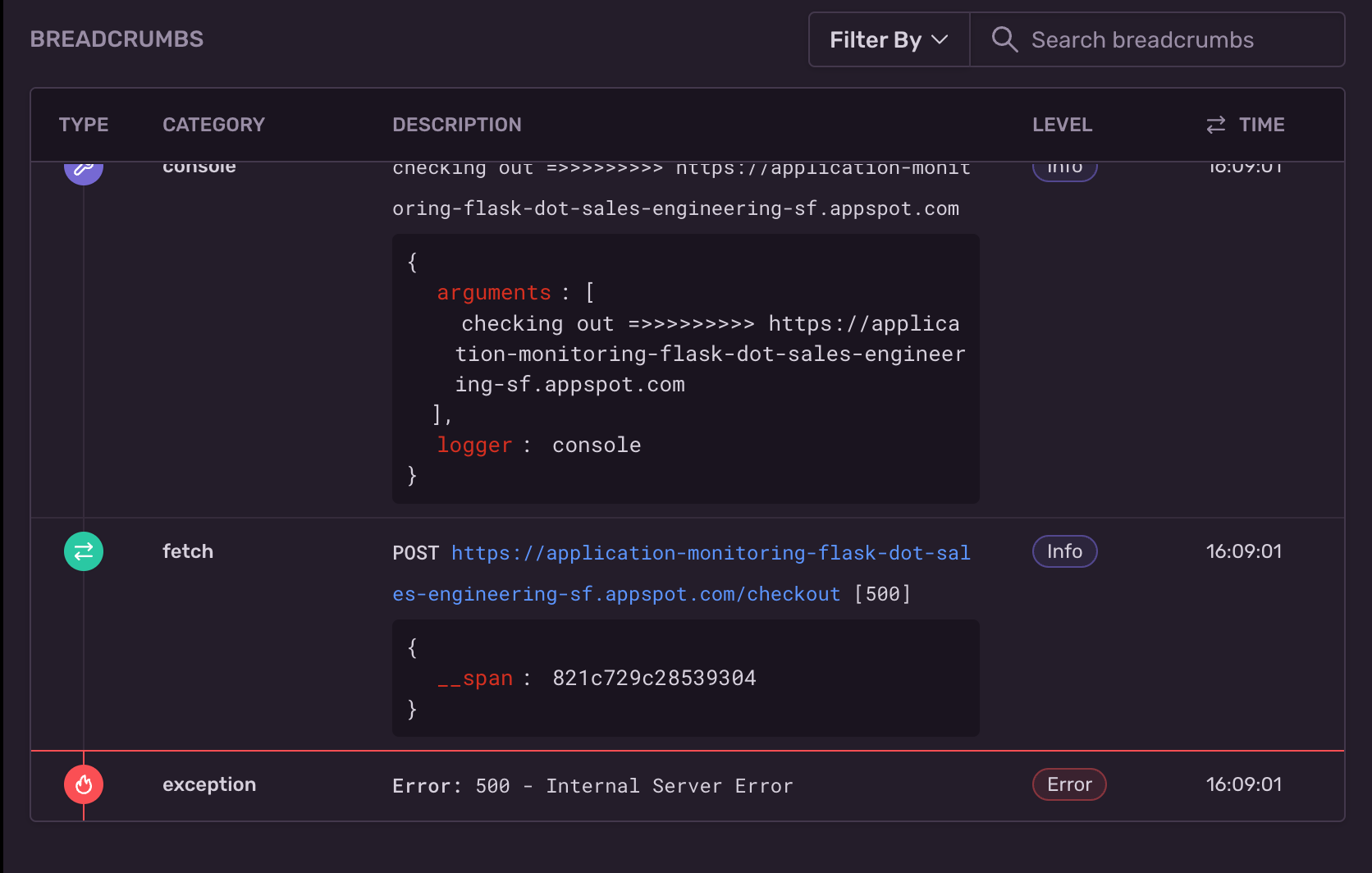 But humor me for a minute. Let’s walk through what this would look like if we didn’t monitor our whole code base. The 500 error would give us only one clue: the time. In order to see what’s really going on, we’d have to comb through the logs and look at each event around the same time the 500 error fired. After that, we’d try to recreate the error based on which events in the logs we thought might be the culprit.