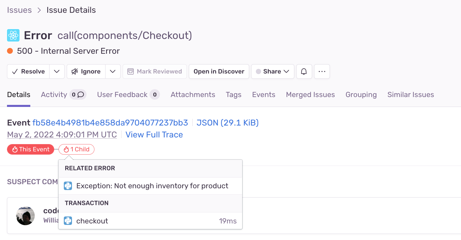 In this case, there are two related problems: an error on the frontend and an unhandled exception for when we’re out of inventory on the backend. Additionally, we’re seeing a pretty slow experience as a side effect of the broken checkout flow. Because we have Sentry looking at our JavaScript and Python projects, the problem is obvious – people can’t buy things we don’t have.