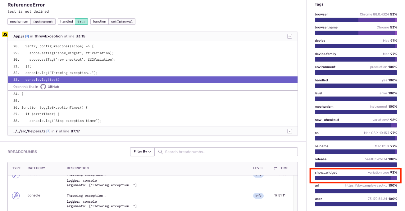 Sentry.setTag("show_widget", user.showWidget);After you start passing in feature flag data, you'll begin seeing your new tags in Sentry. In the example below, you can see that this issue primarily impacts those users who are seeing our new widget feature.