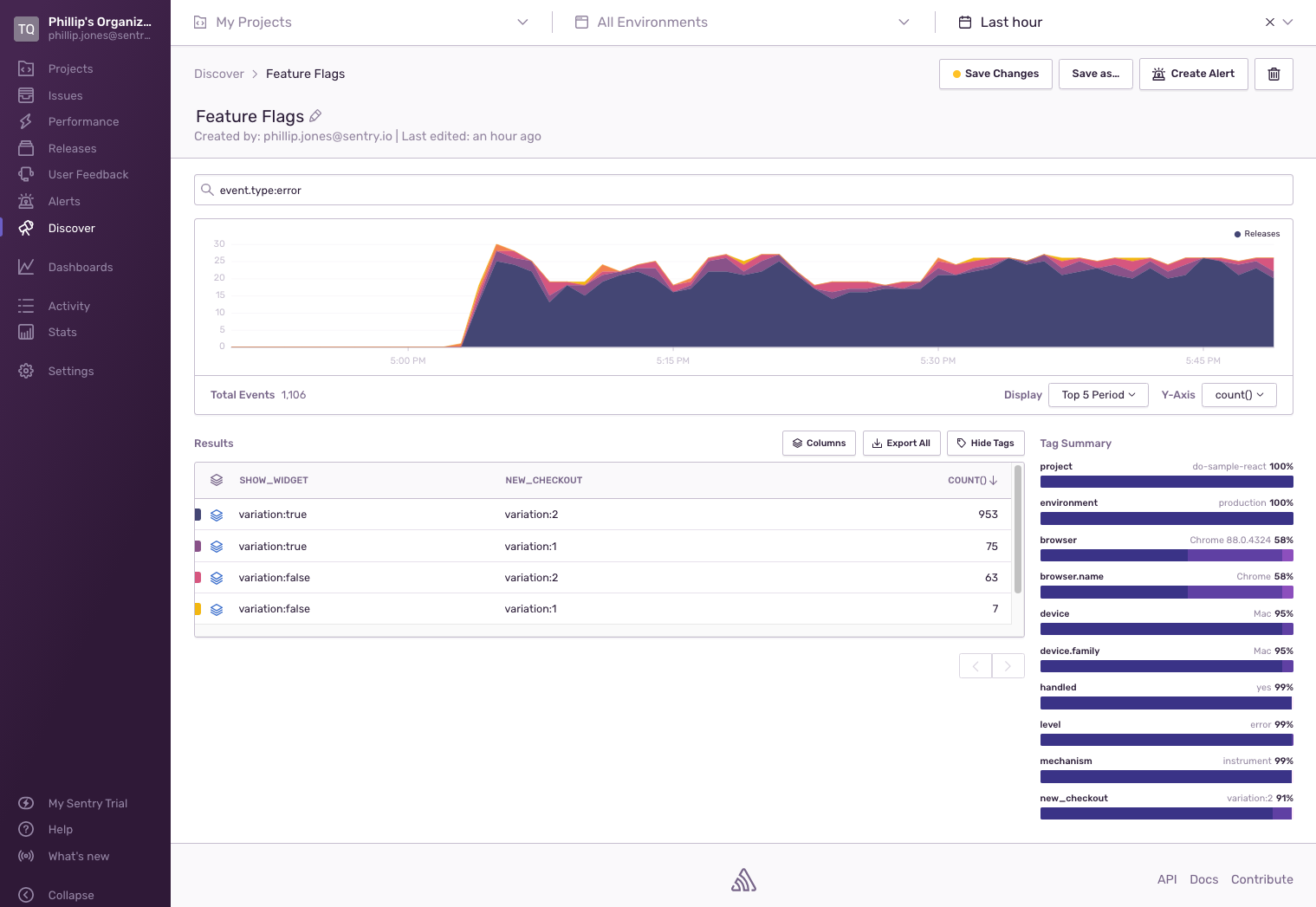Once you have your tags set up, you can use Discover to see which combination of feature flags are causing errors or performance issues.