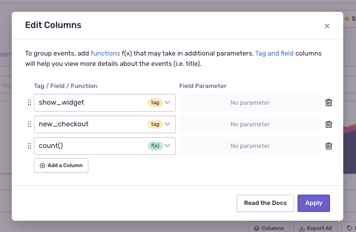 In Sentry, navigate to Discover and click Build A New Query. Then, add columns for each of the feature flags/experiments in question.