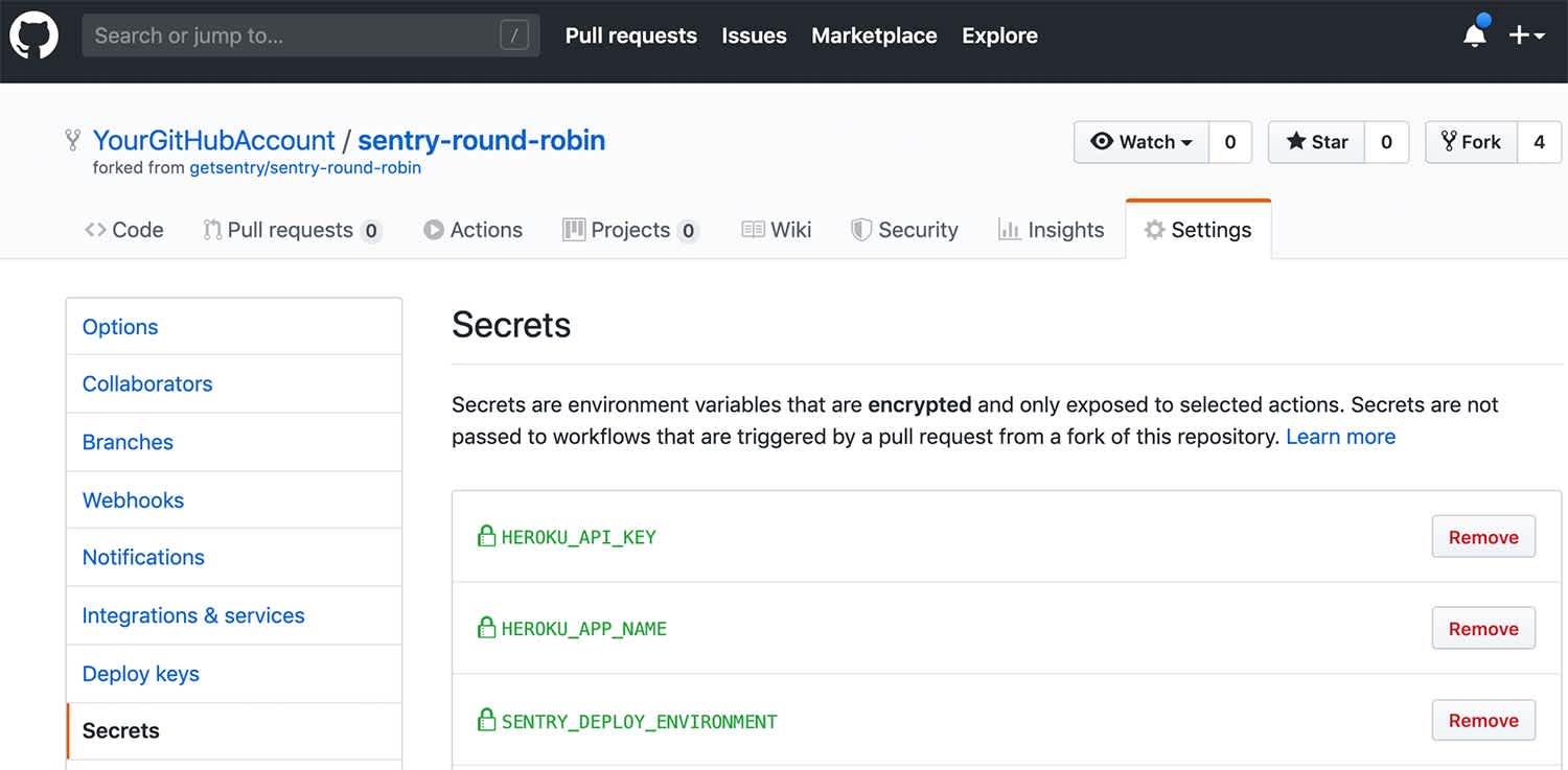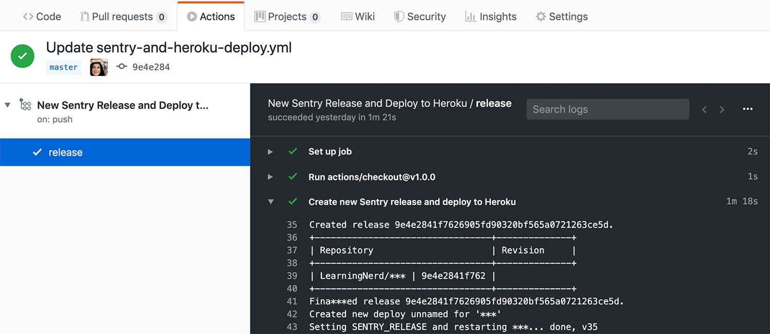If we also wanted to deploy our app to (for example) Heroku, we can take advantage of the fact that Github's virtual environment includes the Heroku CLI by default. Just a couple more commands will update Heroku's environment variable for the SENTRY_RELEASE and then deploy the app to Heroku: