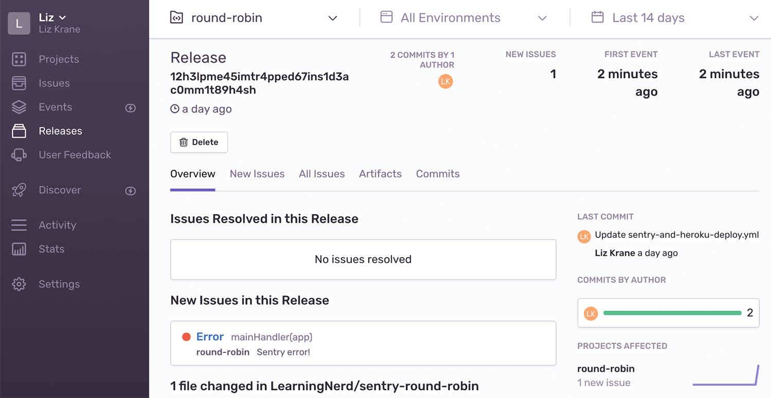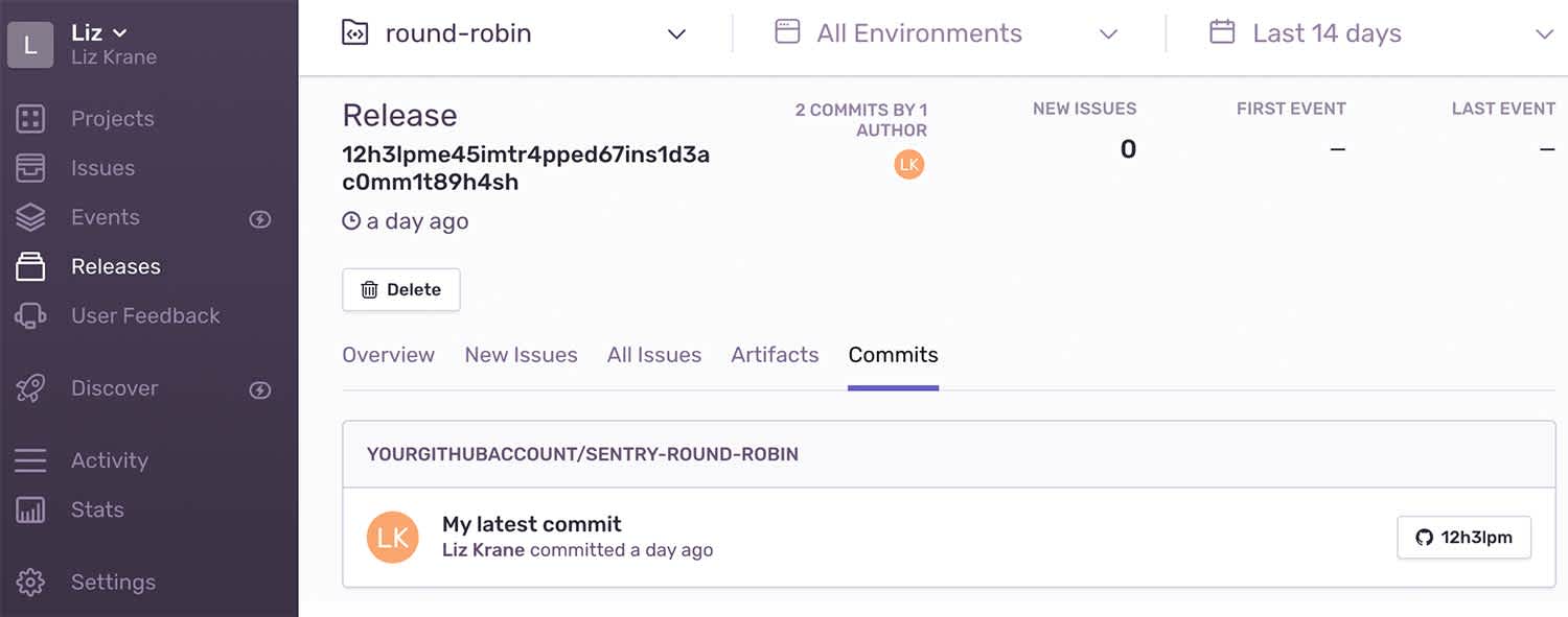 After triggering a new error, check your project's "Releases" page again in Sentry. On the page for your latest release, you'll see a new unresolved issue associated with the release: