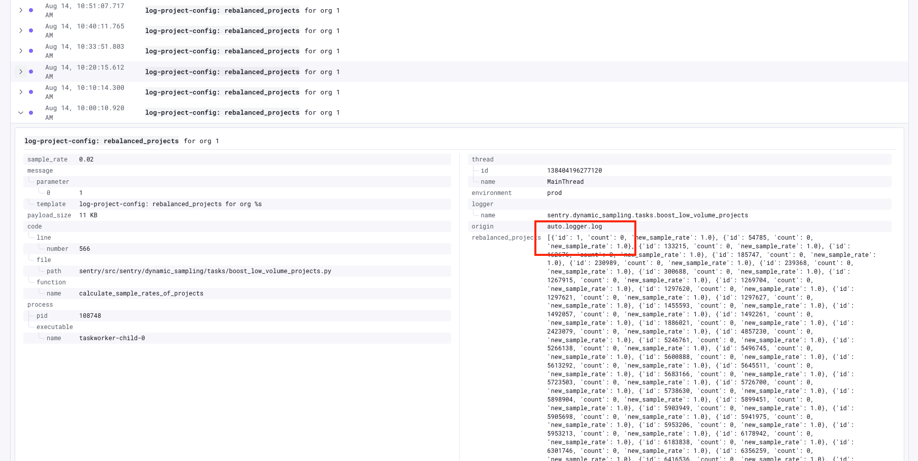 Sentry Logs had shifted our focus from debugging our application logic to investigating the upstream data source. By building up a kind of namespace for debugging dynamic sampling using a log prefix, we could see the state of different tasks running after each other in a single place: