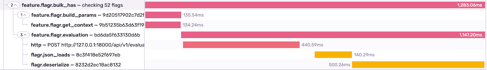 At first glance, it seems as if evaluating all 50 feature flags is the reason for the 500ms delay. But thanks to Performance’s auto-instrumentation, we can see that the HTTP call to the Flagr API only took 70ms. So the next step here was to manually instrument Flagr’s Python client to get a better understanding of what was going on. Our assumption was that the main performance hit was happening when we were trying to deserialize the flags: