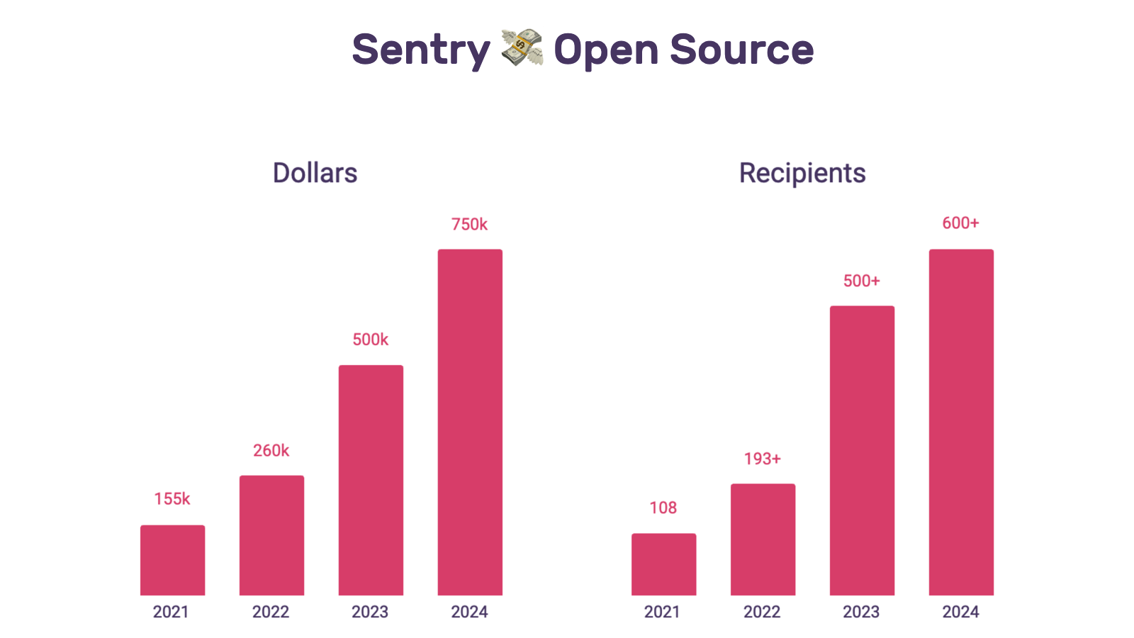 Sentry started out as an Open Source side project in 2008. Today we are a Fair Source company with 100,000+ organizations on our SaaS and $100M+ ARR, but we have not forgotten our roots nor the hundreds of Open Source maintainers whose work we depend on for our success. Every year we share our success with the community, and 2024 is no different. This year, our budget is $750,000, up 50% from last year. We have 129 engineers right now, so that works out to $5,813 per developer on staff.